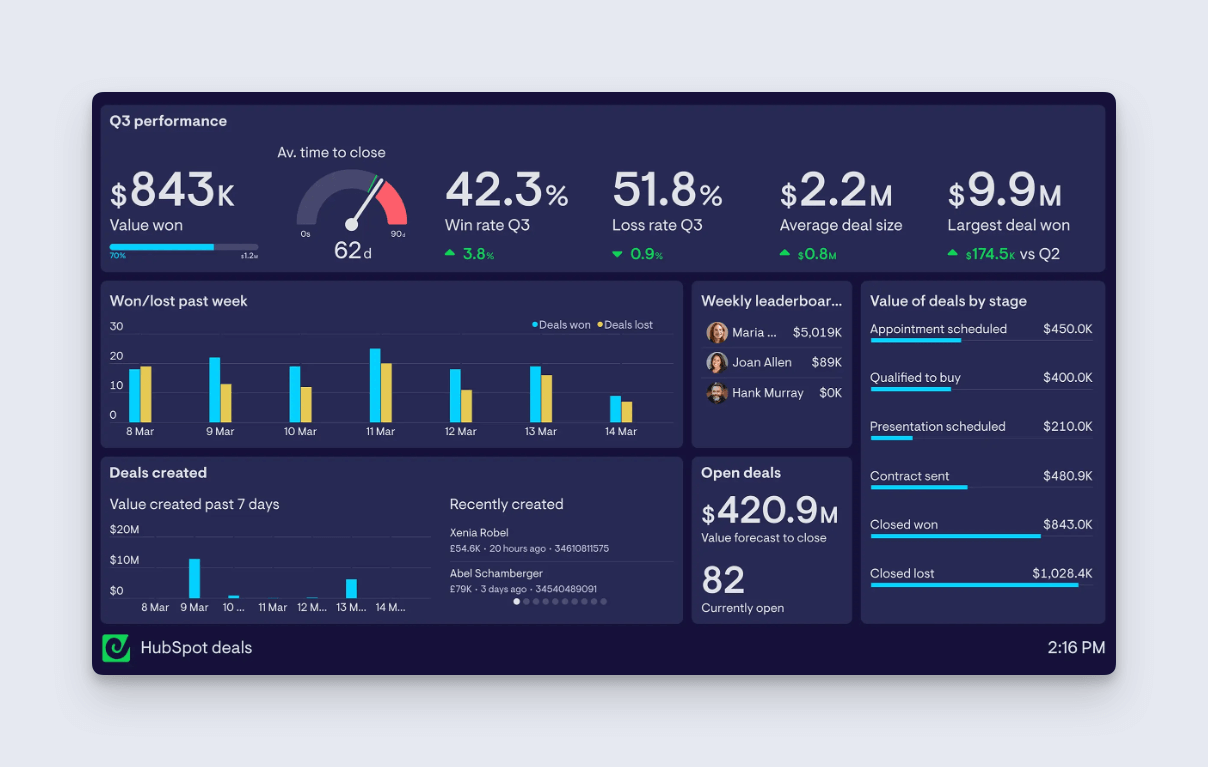 Geckoboard is an alternative to Looker Studio, which has a pre-built integration with HubSpot, as well as over 90 other data sources including Google Sheets, Zendesk and Google Analytics.