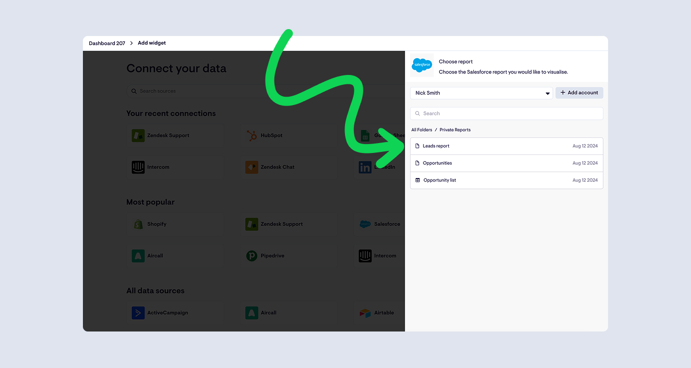Once connected, you’ll see a list of your Salesforce reports in Geckoboard. Select the report you want to visualise.
