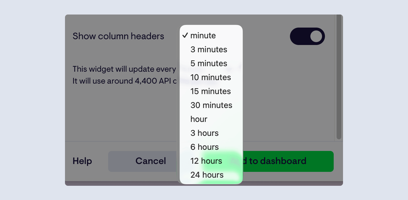 Salesforce widgets have a user-configurable refresh rate in Geckoboard. You can choose how frequently widgets refresh, down to the minute, or dial it back to reduce API usage.