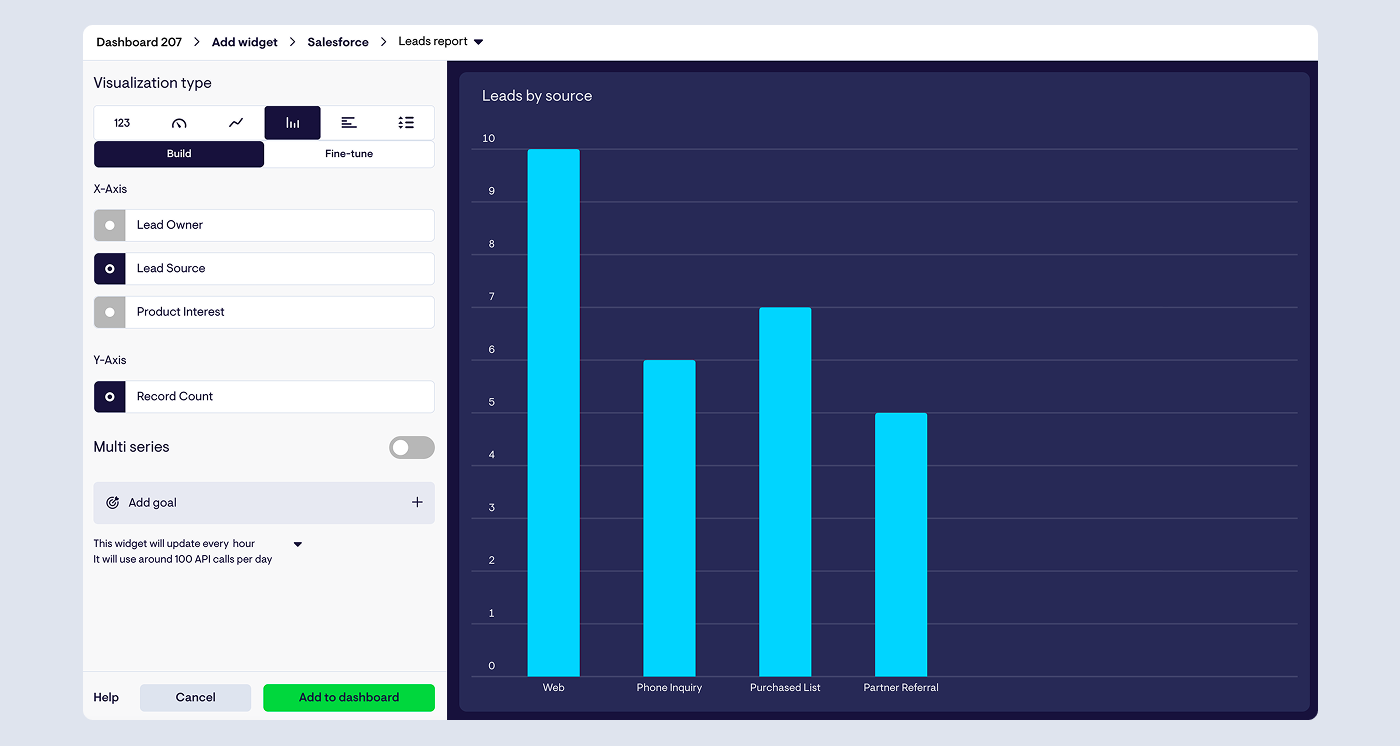 Pick a widget type, configure how the report results are displayed, and click Add to dashboard.