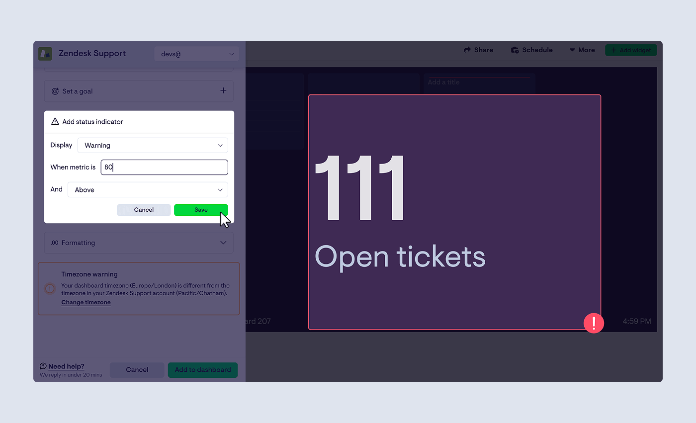 Connect your Zendesk account and build a dashboard with some Zendesk data you’d like to monitor throughout the day. (Learn more about Geckoboard's Zendesk integration and how operational dashboards differ from Explore.)