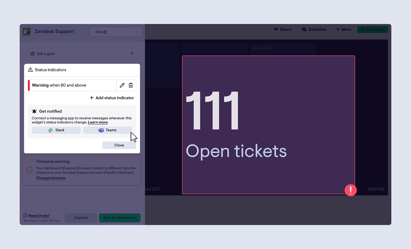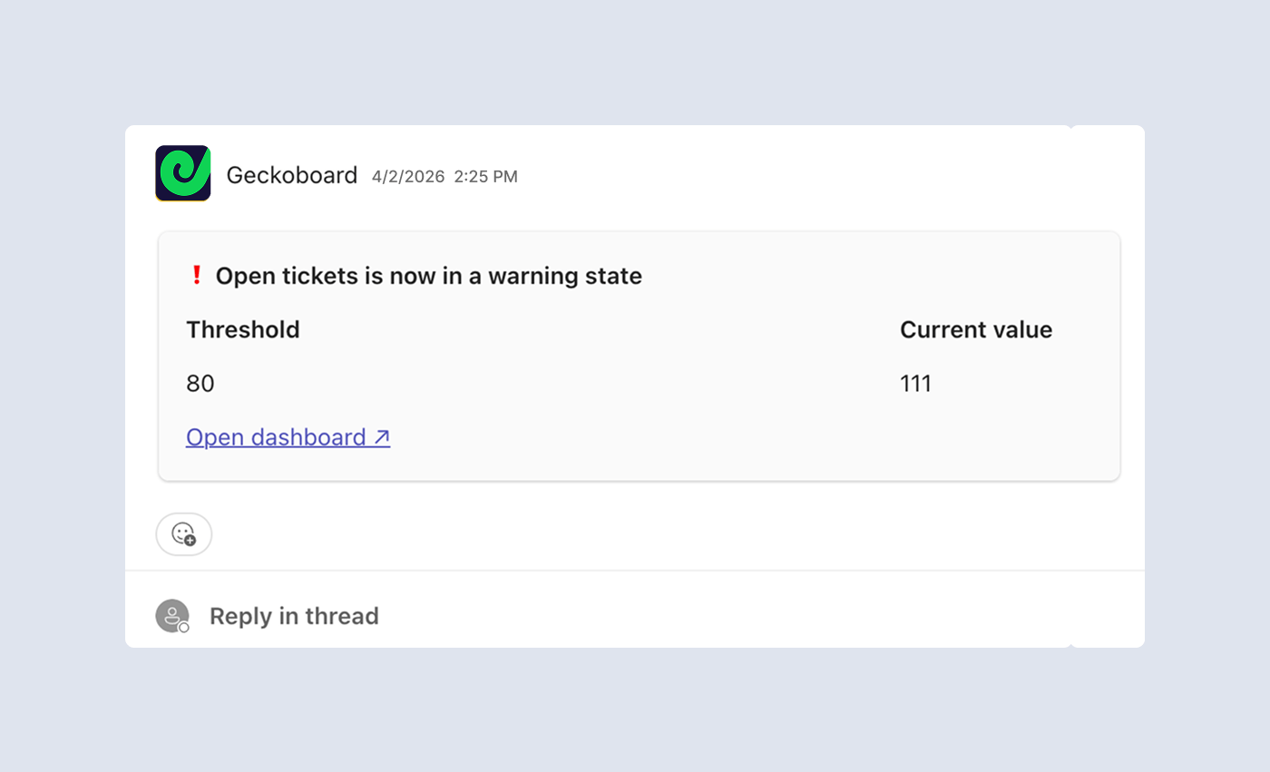 Geckoboard offers real-time KPI alerting to Microsoft Teams when a Zendesk metric hits a threshold, so discussions can happen where agents are already working.