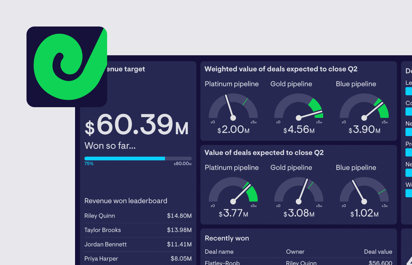 Why sales teams need it: Sales teams thrive when they have clear insights into their performance metrics. Geckoboard helps by visualizing key sales data, such as deal pipelines, revenue targets, and performance KPIs. Teams can monitor their progress on customized dashboards, giving them the clarity they need to stay on track. Plus, it pulls in data from many of the other tools listed in this post.
