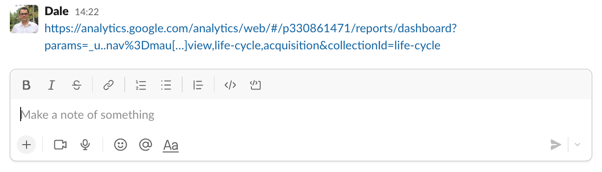 Once you’ve created custom reports in Google Analytics, it doesn’t take much effort to just share a link in a Slack channel every day, or every week.