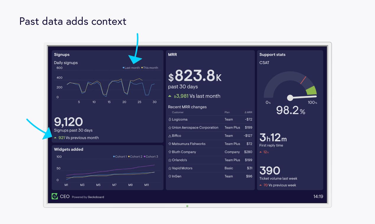 Take the above dashboard example. To help teams understand Signups, we’ve added past data in the form of: