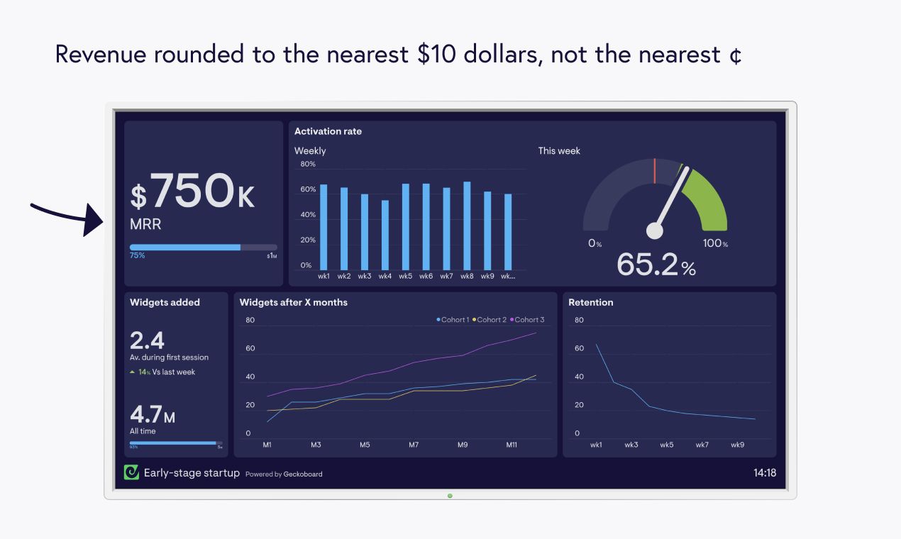 It’s generally best to round your numbers, like we’ve done on this dashboard example for MRR and Widgets Added.