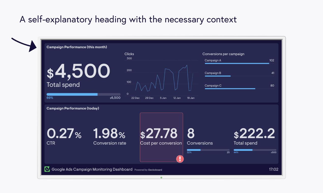 Labels are an easy way to make your metrics and charts instantly understandable for your team. They should give the necessary context – like Campaign Performance (this month) – and make the meaning obvious. But keep them short so they don’t take up useful space on your dashboard.