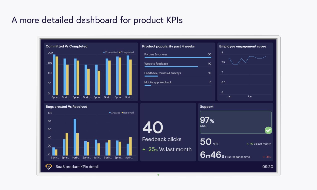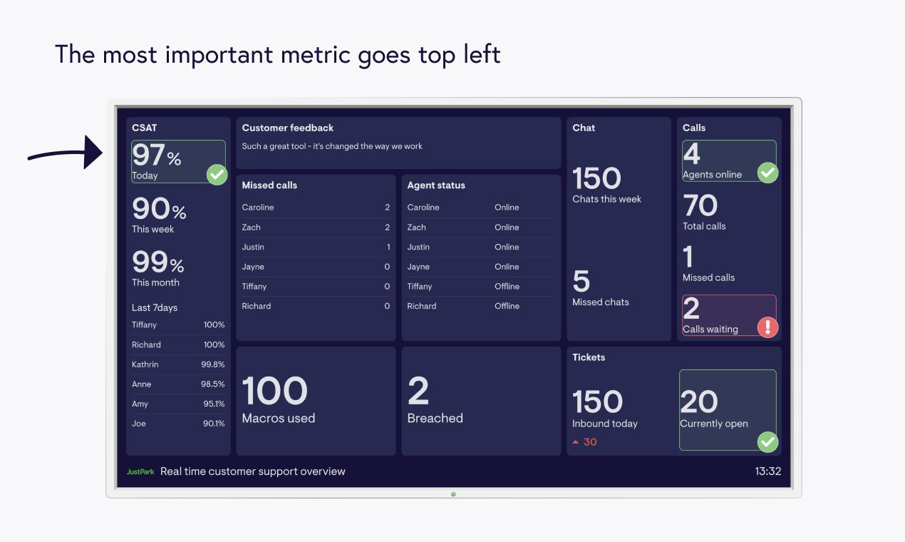 Anything you include on your dashboard should be important, but some things will be slightly less important than others. To make priorities clear to your team, you can use size and position.