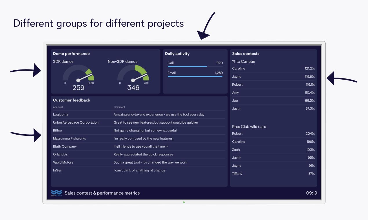In Wordstream’s sales dashboard example, they’ve created groups for different projects, and they’ve given each a clear label so they’re easy to spot.