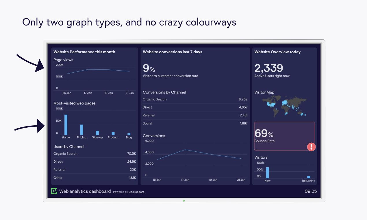This dashboard example sticks to line and bar charts – and there's a visitor map but only because that's the most appropriate visualization. For Users By Channel, we could have used The Chart That Must Not Be Mentioned (the pie chart) but instead we've used a table which is much easier to understand at a glance.
