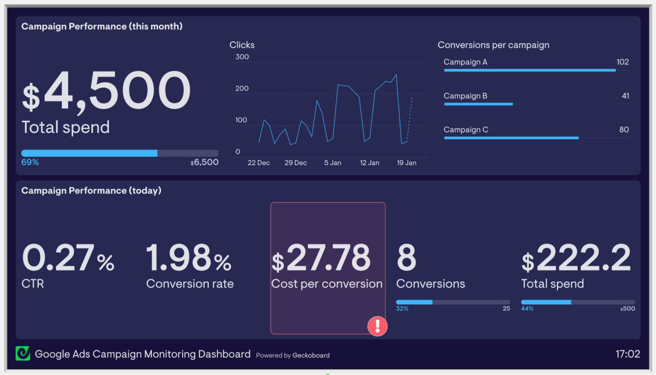 A dashboard tool is one way to share regular updates on your KPIs. It functions like a mini KPI report by displaying your team’s most important metrics and updating them in real time.