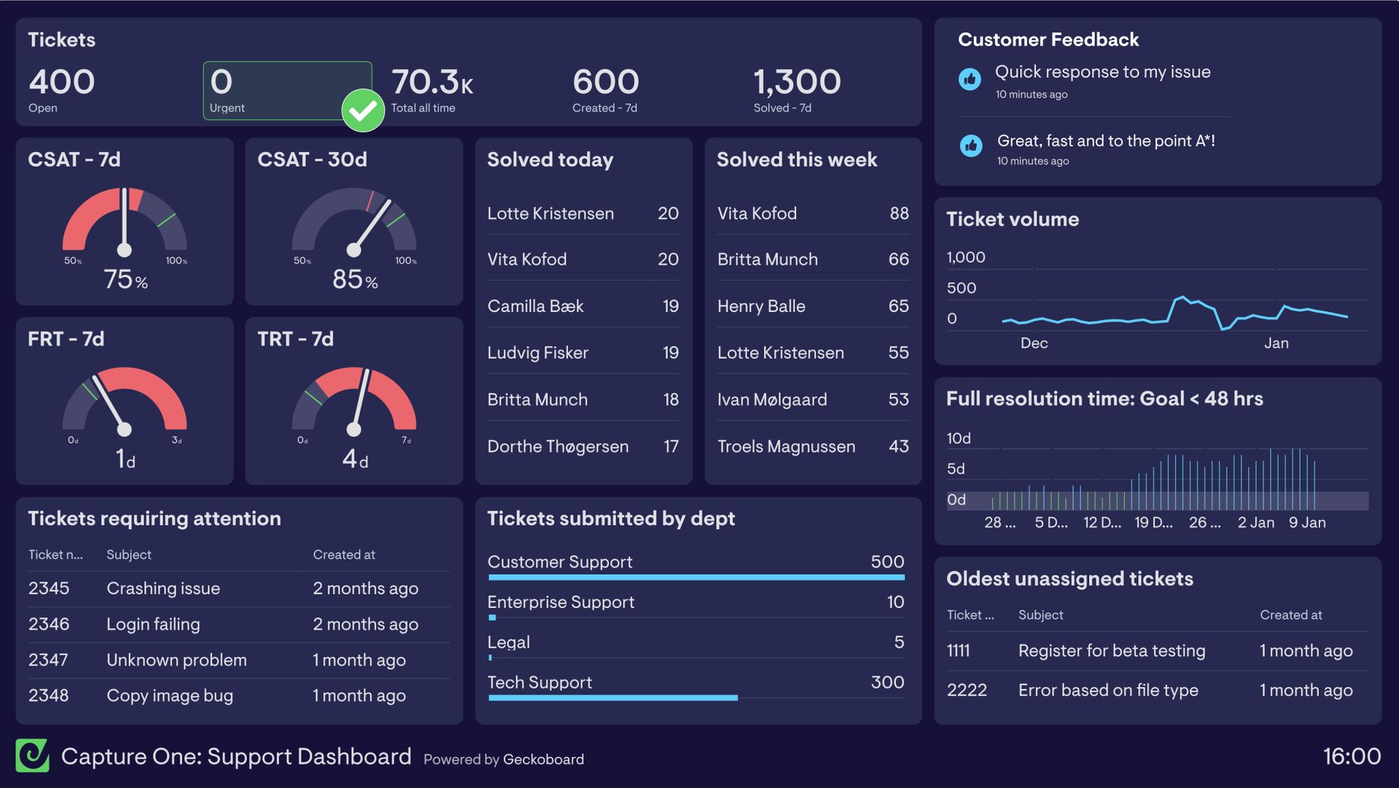 I’m Jesper Rosenkrantz, Head of Support at Capture One. Capture One is a powerful photo editing application. We’re based in Copenhagen, have a Support team of 14 agents and use Zendesk Support as our ticketing system. Our Geckoboard dashboard helps us keep track of whether we are reaching our targets and to share our key support numbers to the company leaders and the rest of the organization.