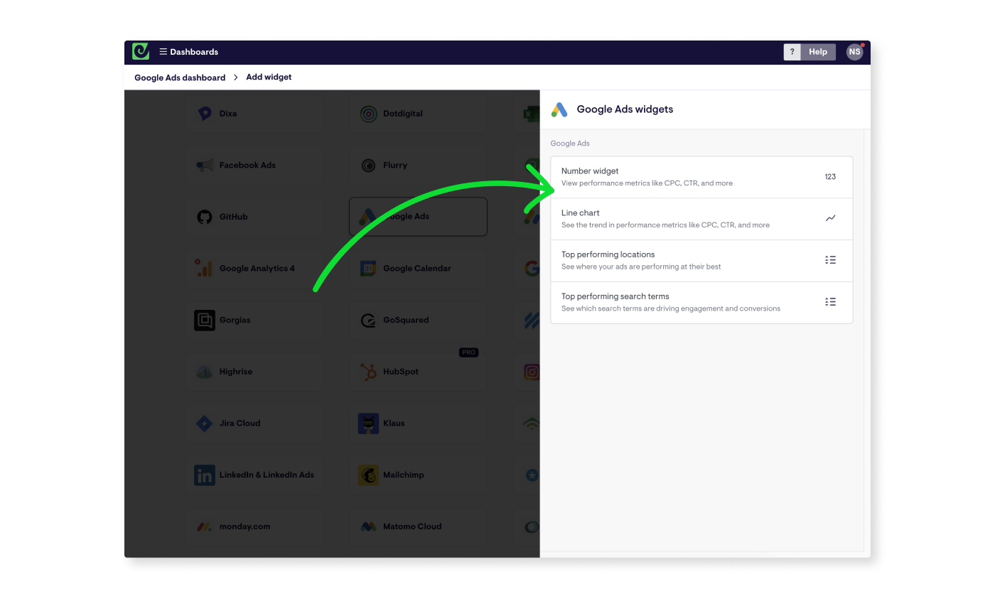 These work in much the same way as the Google Ads integration; from your dashboard click ‘Add widget’, select a data source, and follow the instructions to set up a connection and build a widget.