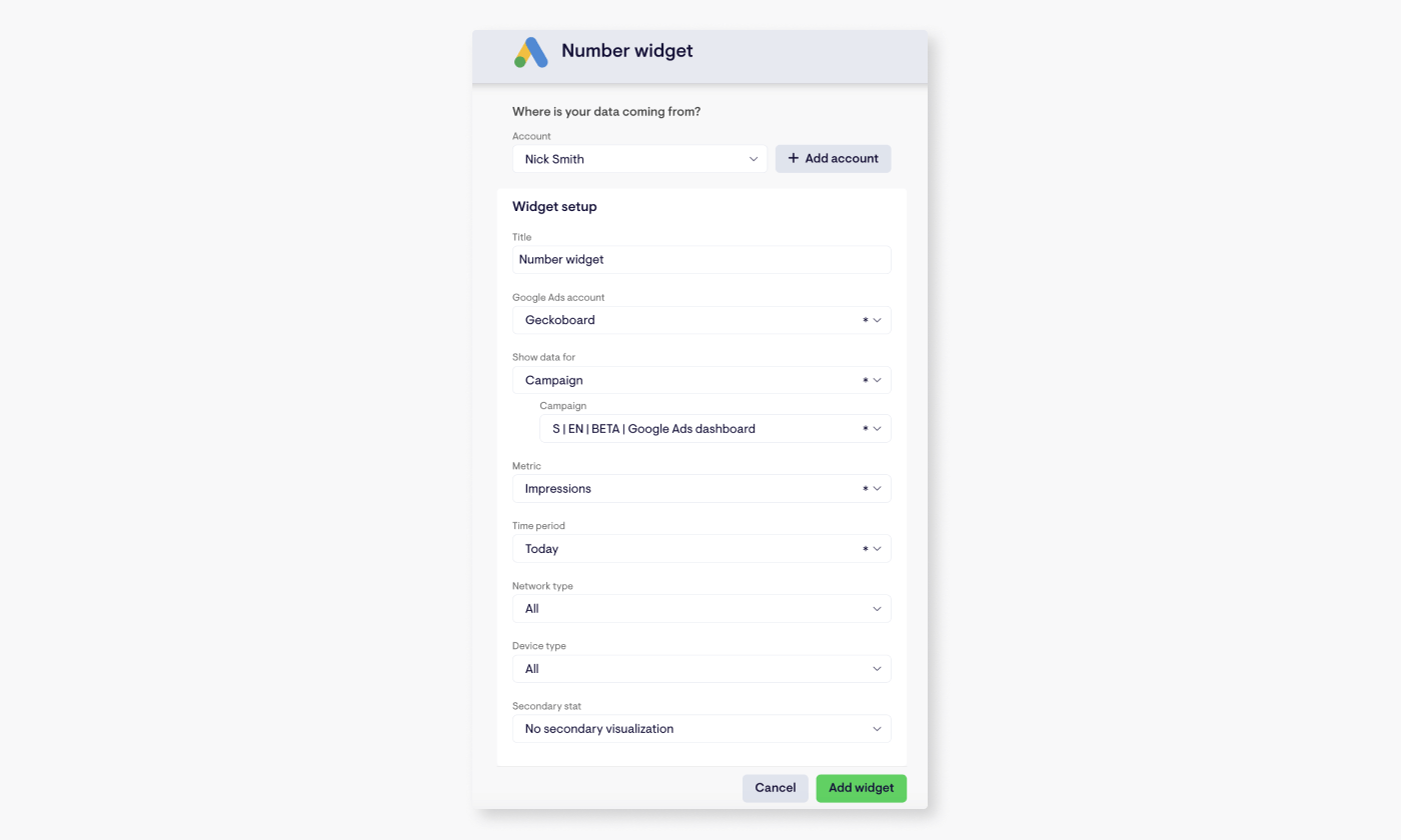 When you’re happy, click ‘Add widget’ to jump to your dashboard, which will now contain your first block of live data! Geckoboard’s Google Ads widgets refresh every 5 minutes automatically, so your dashboard will always display up-to-date information for whoever looks at it.