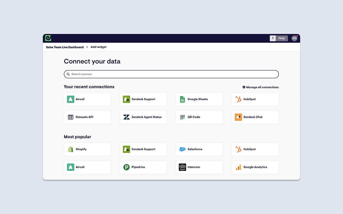 With Geckoboard you can create dashboards that include data from over 90 tools such as Aircall, Zendesk, Salesforce, or even spreadsheets, meaning your team will never miss important changes to your data, regardless of where it lives.