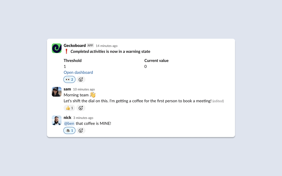 For multi-tool visibility: Alert your team with data from multiple tools using Geckoboard notifications for Slack.
