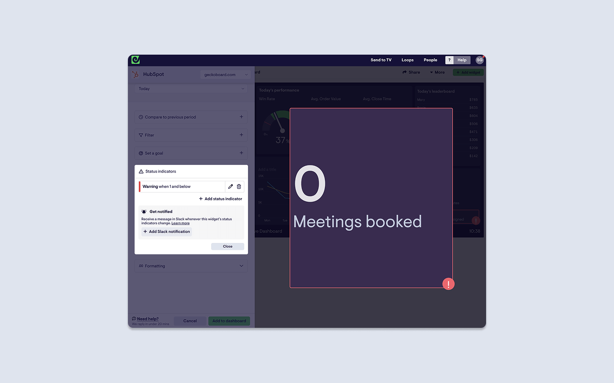 Using Geckoboard’s HubSpot integration, creating custom notifications for your HubSpot metrics takes just a few minutes.