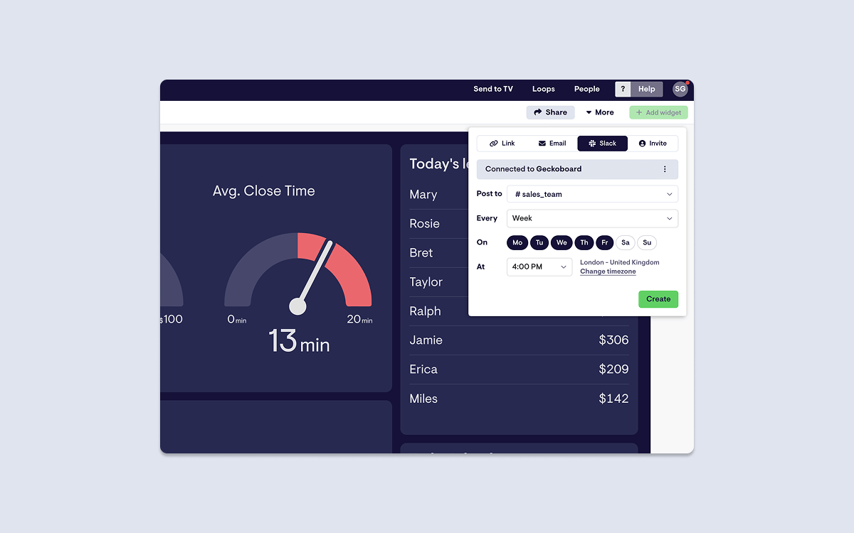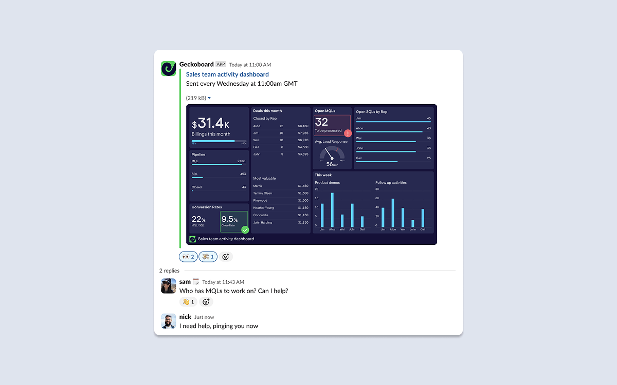 For management oversight: Save time trawling through reports and avoid overly noisy Slack notifications by sending Geckoboard dashboard snapshots to Slack with management-specific data, at a cadence that suits.
