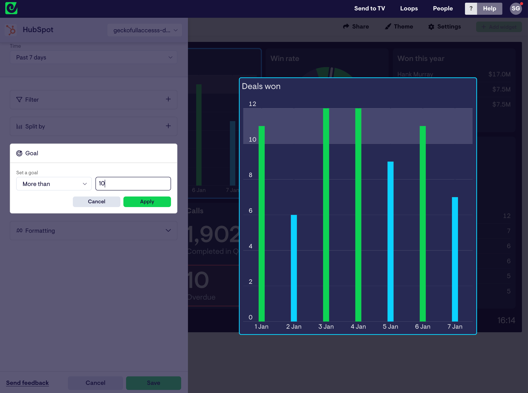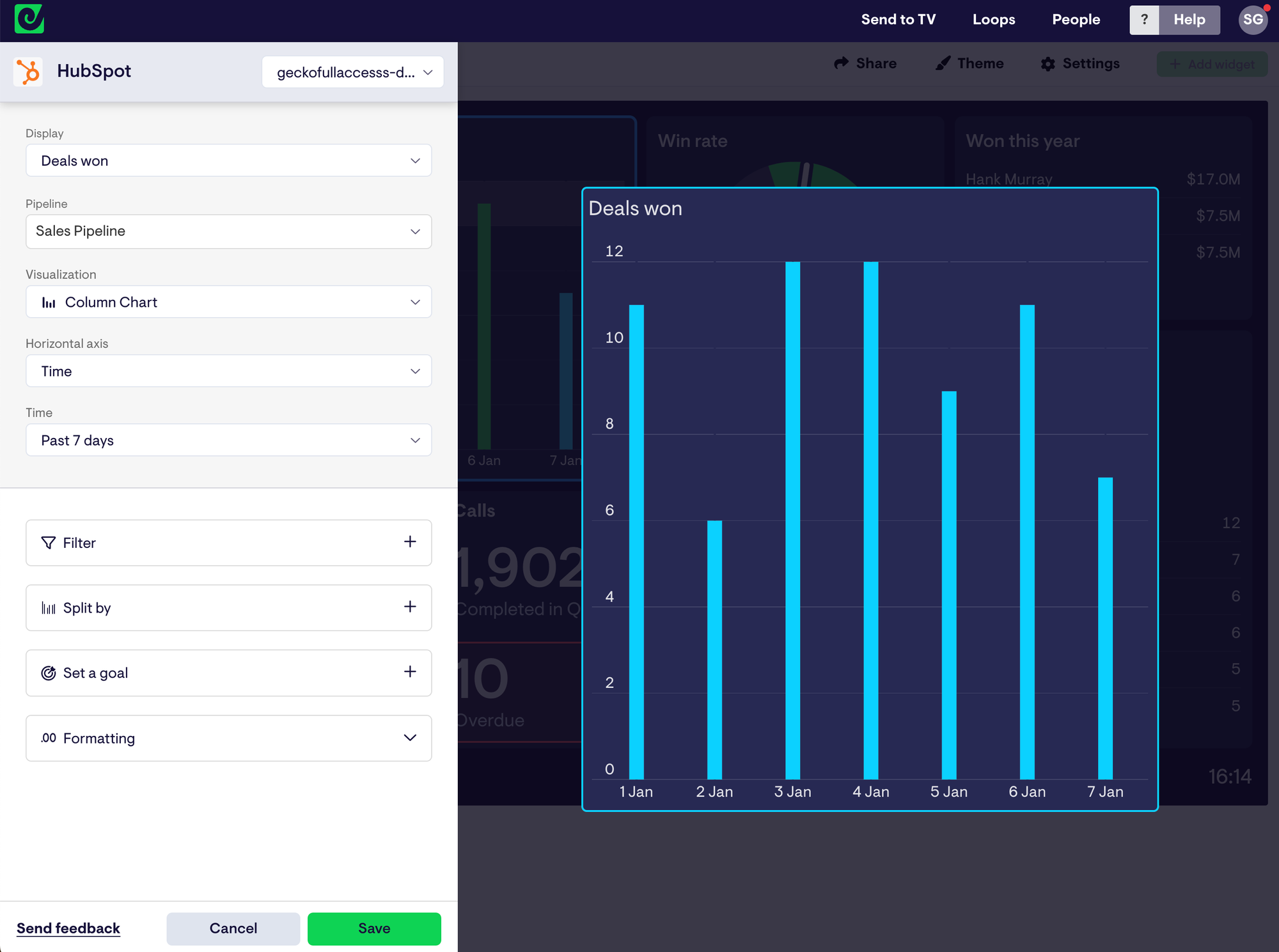 Once you’ve established a connection to your HubSpot account, you can start creating visualizations, called ‘widgets’ – these can include numbers, bar charts, line charts, and leaderboards. That means you can display anything from deals, revenue, or leaderboards that show team performance.