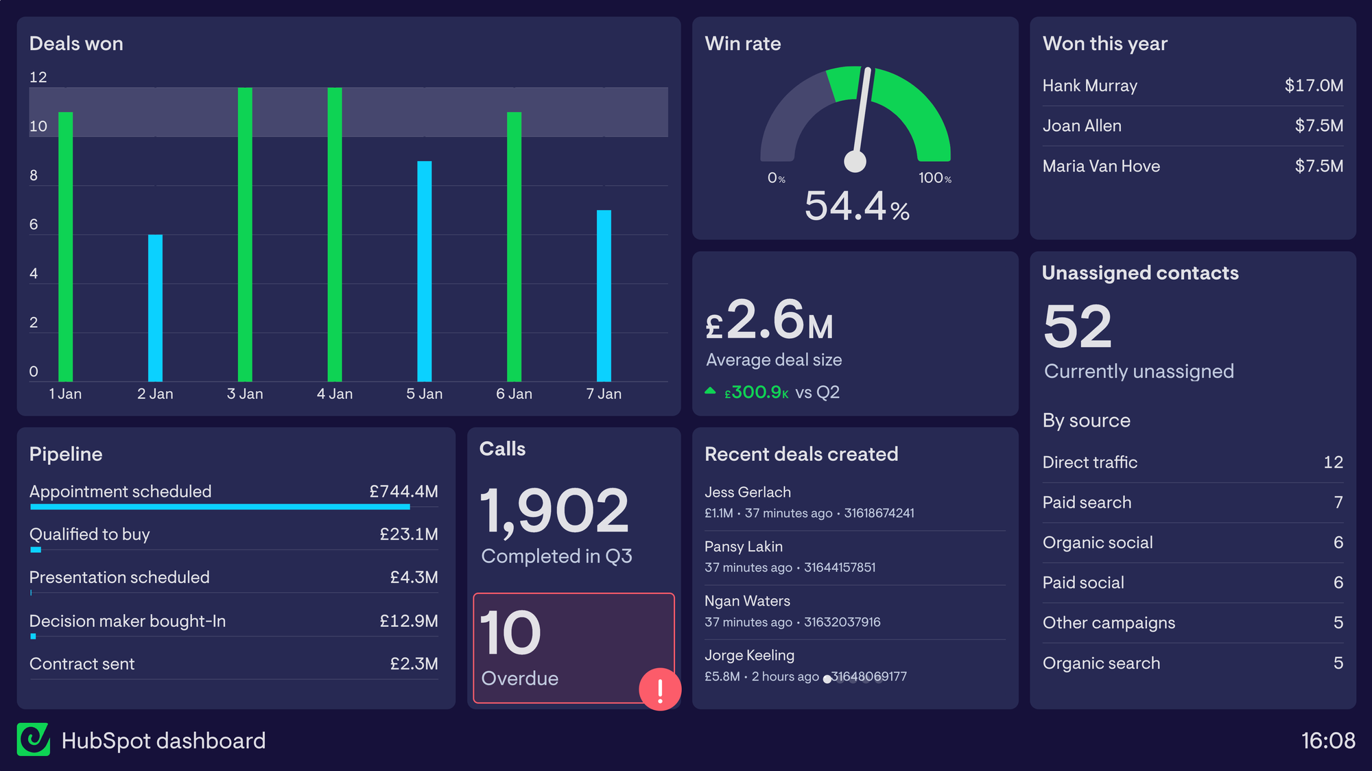 Geckoboard is a KPI dashboard tool that makes it simple to build real-time HubSpot dashboards that improve team performance.