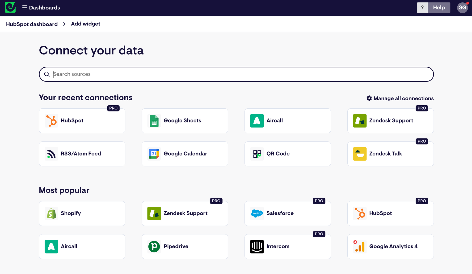 Select any of the widgets to get started, then sign in to HubSpot to set up your connection to Geckoboard.