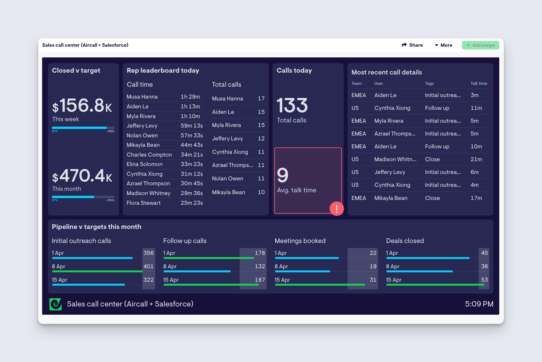 It’s important to say that Geckoboard shouldn’t be seen as a replacement for Aircall’s Salesforce integration (which we do recommend). Fundamentally, they do different things.