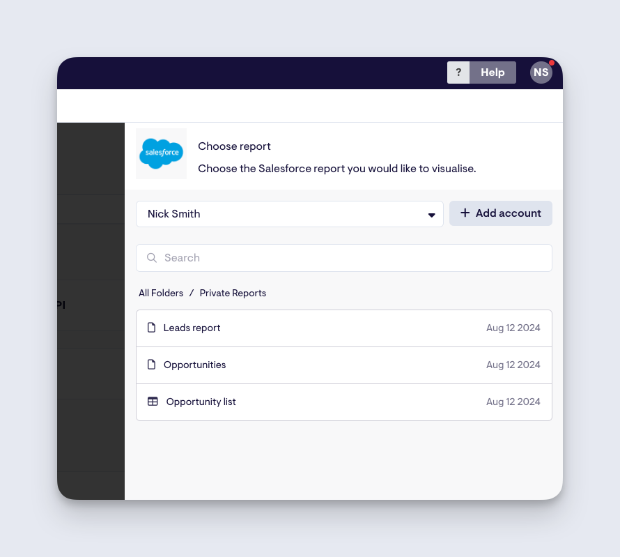 Next, connect Salesforce to start building widgets that visualize your Salesforce KPIs. The major difference between Salesforce and Aircall widgets is that with Salesforce, you will first need to select which Salesforce report you want to visualize data from.