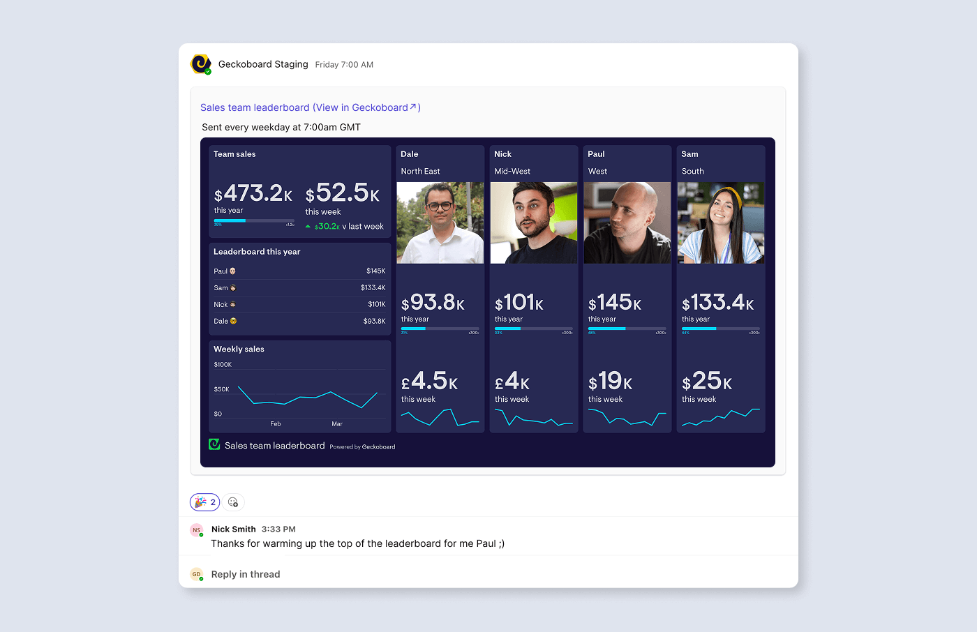 So here’s how to automate it: build a Salesforce-powered dashboard in Geckoboard (kept in sync with your Salesforce reports), then schedule Snapshots to post it into Microsoft Teams automatically - on the cadence your team actually uses.