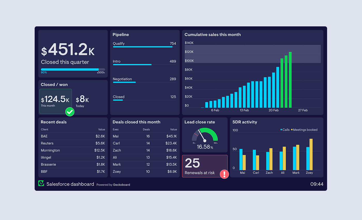 For a quick overview of how to build up a Salesforce-powered dashboard with Geckoboard, watch this quick video: