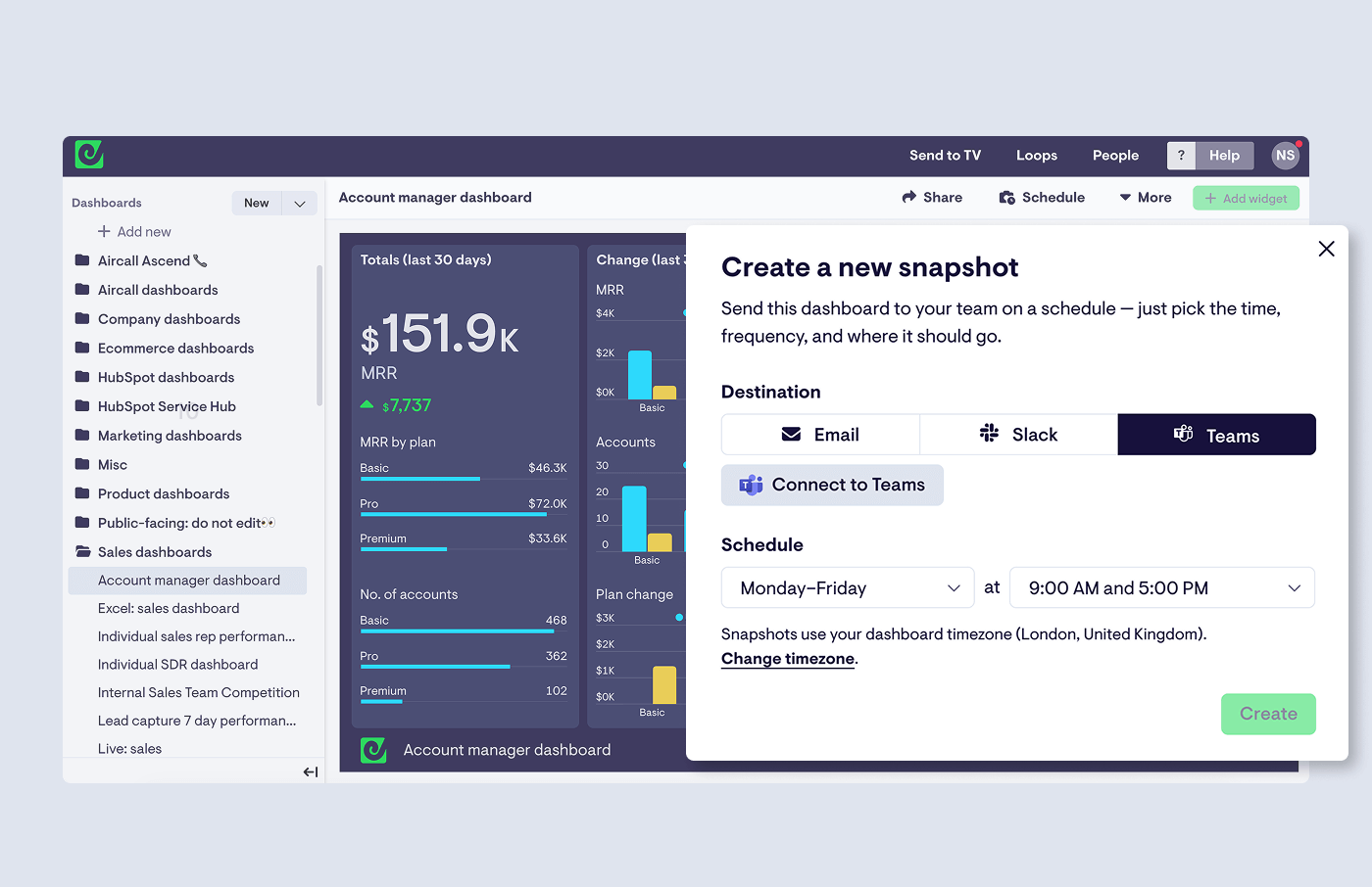 Once your dashboard is ready, you can post it into Microsoft Teams automatically by scheduling Snapshots.