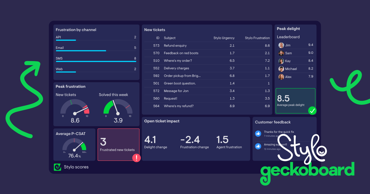 Together, Geckoboard and Stylo help support leaders see customer emotion, risk, and urgency alongside their existing Zendesk metrics - clearly, in real time, and in one shared view.