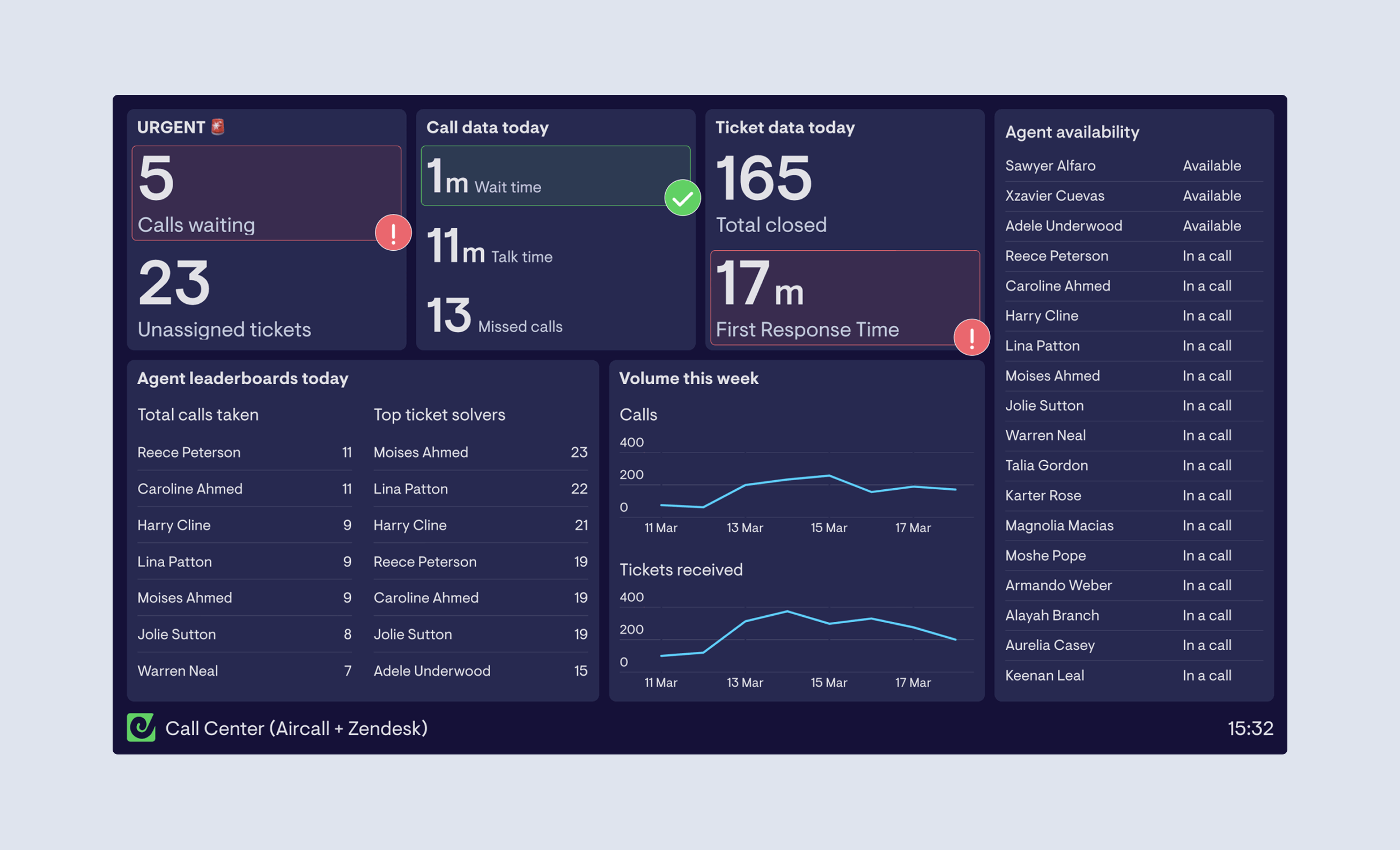 A call center dashboard is a typical example of a monitoring dashboard. At a glance, this shows you important information, which is helpful for managing your day to day operations.