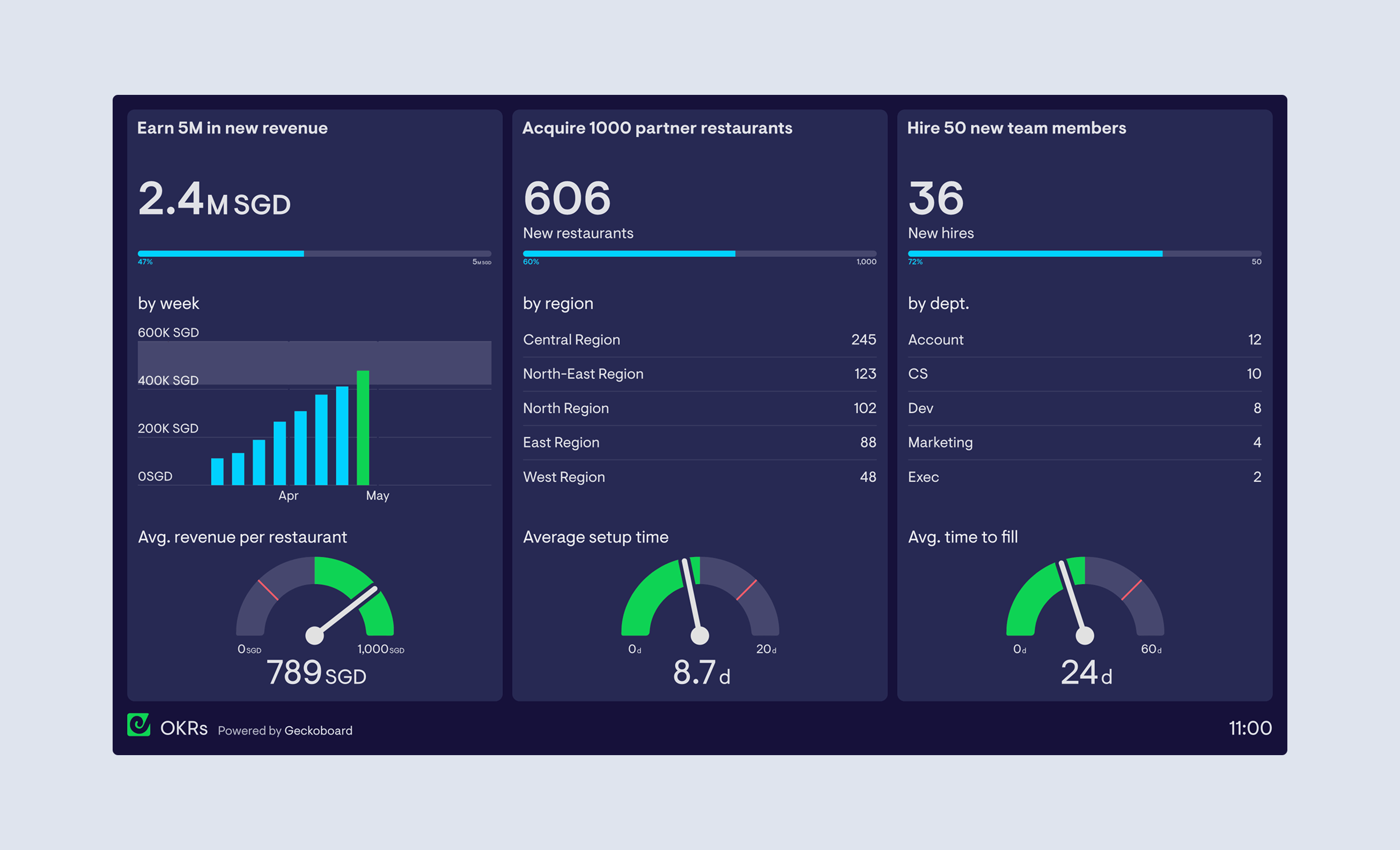 Normally, managers set up these dashboards during (or shortly after) a period of goal setting. For example, you’ve just set your annual sales targets, or you’ve introduced an OKR framework, and you want a dashboard that reflects your current OKR progress.