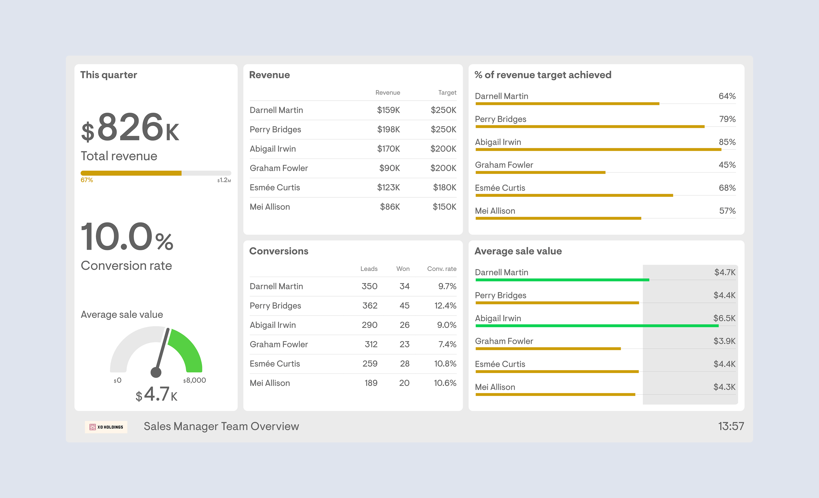 What’s more, by visualizing the metrics that matter, you can help your team focus on the areas that will create the most impact. Typically, a performance dashboard doesn’t just include overall targets – it can also include metrics you want your team to focus on improving. For example, a sales dashboard that includes conversion rate, as well as overall sales.