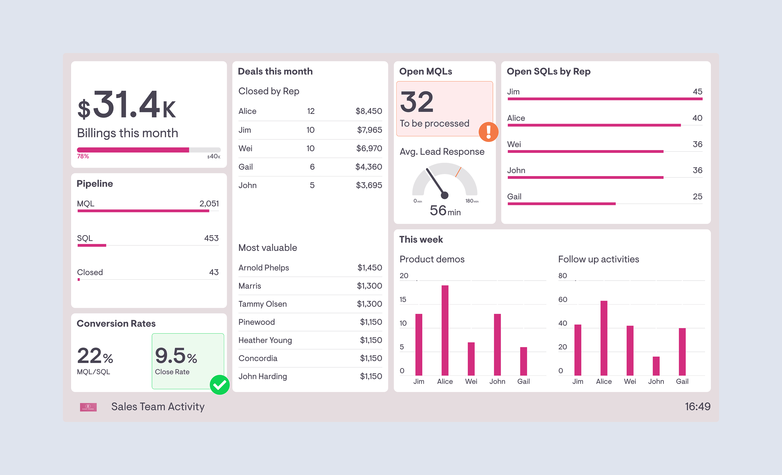 Performance dashboards are useful because they promote accountability, motivation and a sense of friendly competition. They also help to reiterate your business goals, long after you've set them. (Because what’s the point of goals that get forgotten after a few weeks?)