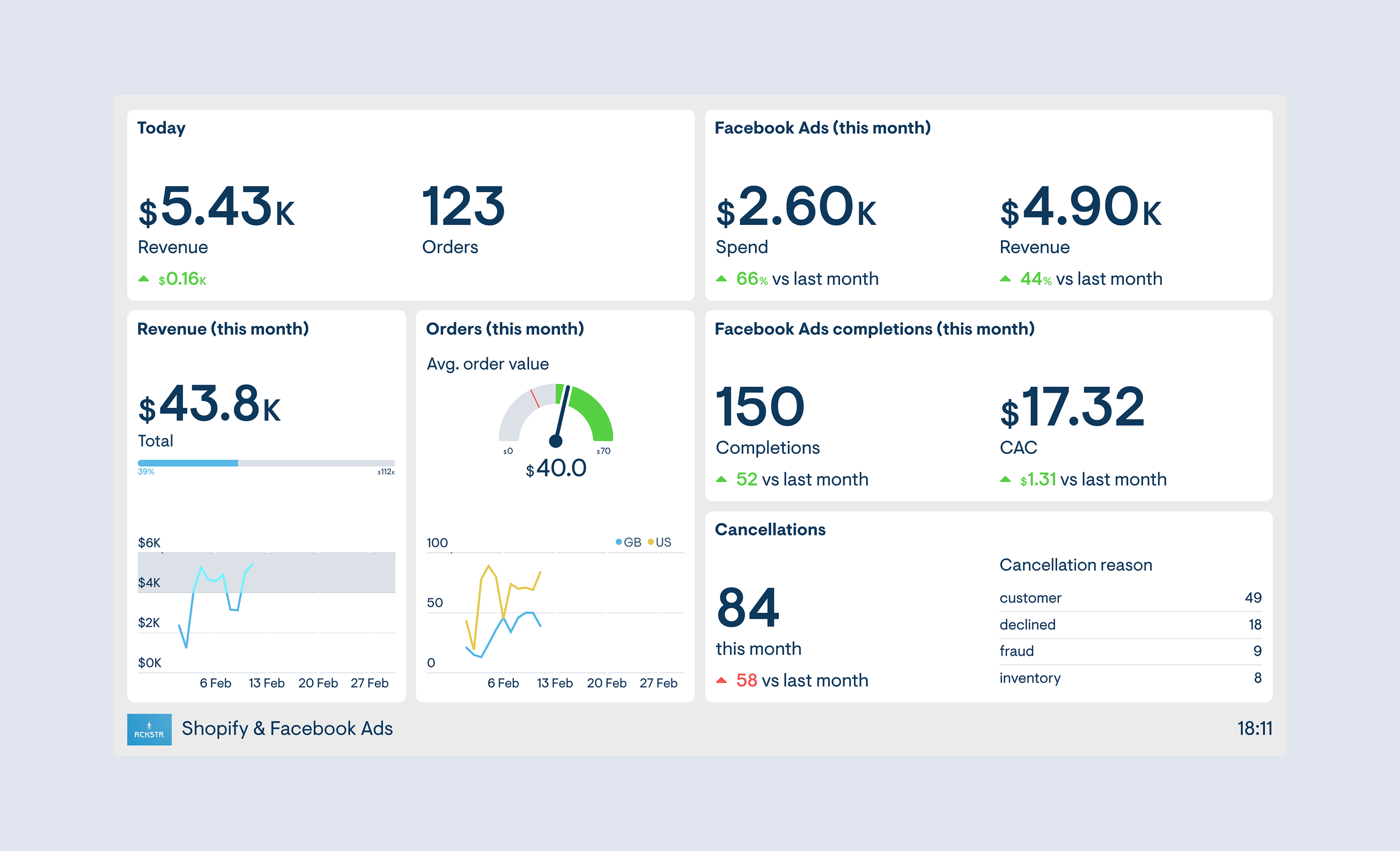 This dashboard has been designed to monitor KPIs, set by an ecommerce store owner. It displays metrics from different data sources – Shopify and Facebook ads. These are platforms which can be quite time consuming to access via their reporting tools. By visualizing real-time metrics from both platforms on one dashboard, you can save time and increase your responsiveness to important changes.