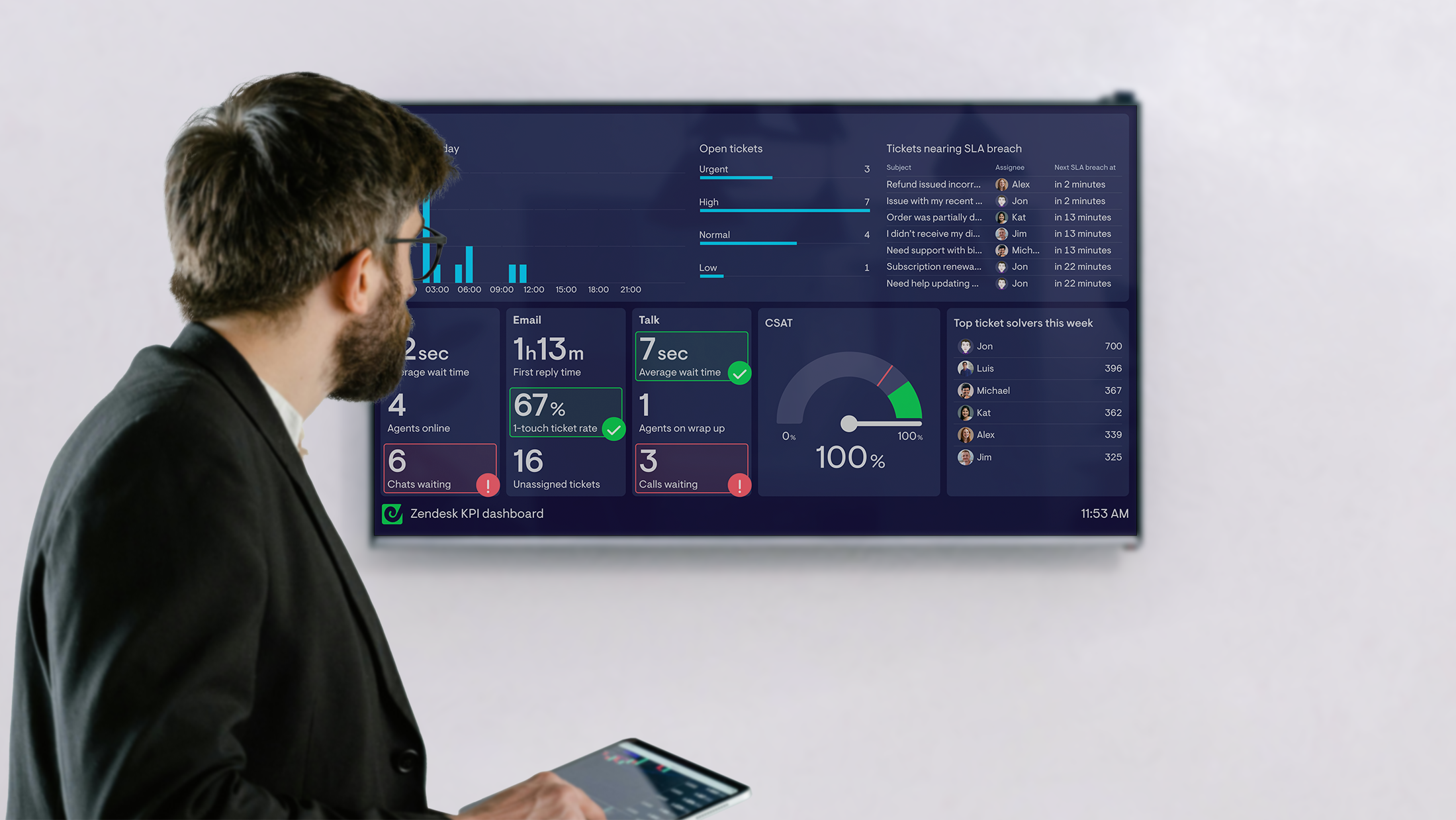 While Zendesk Explore is great for analysis, it falls short here; it's built for deep dives, not motivating displays that update in real time.